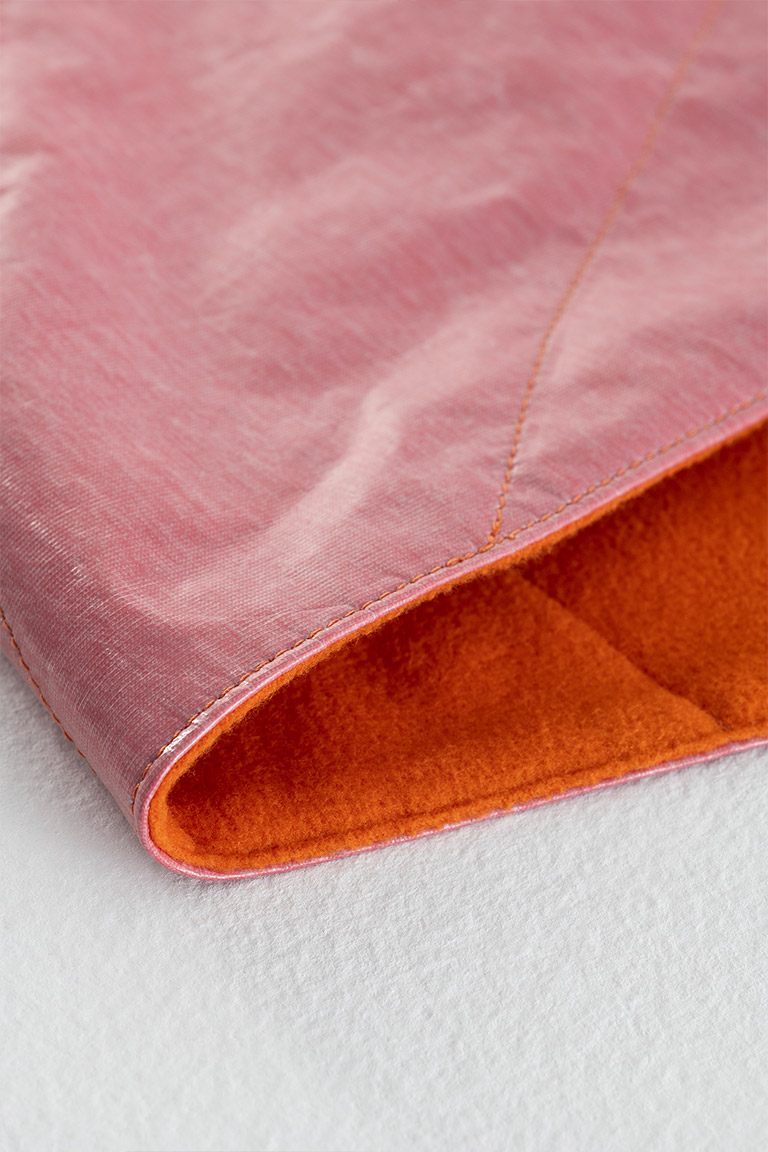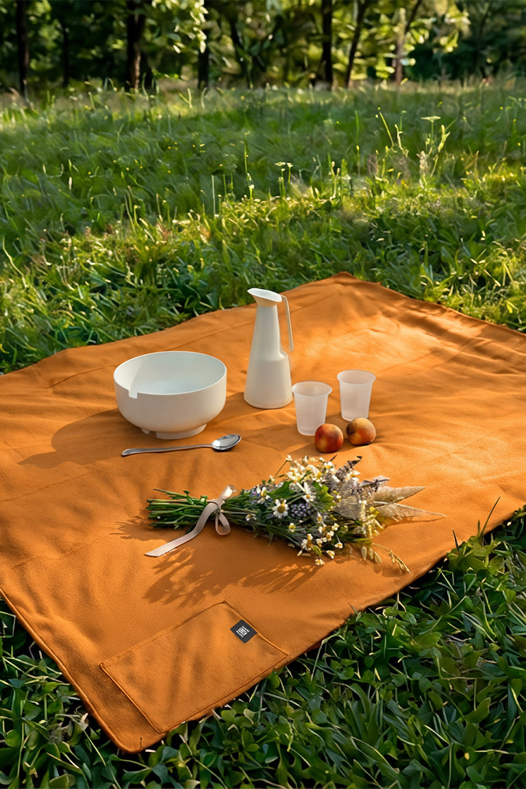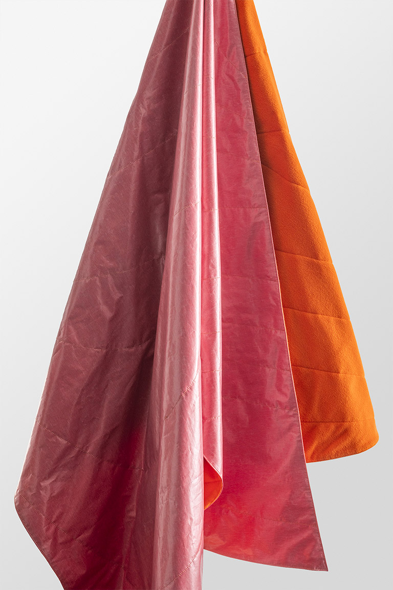 A transformable picnic blanket conceived as an open, adaptable object for different moments of use. A large double-face rectangle: soft and welcoming on one side, waterproof on the other. Loops, a cord and a pocket suggest multiple folds and configurations, allowing it to easily become a shawl, a throw or a hanging element. Inspired by the natural movement of fabric as it opens and closes, the project explores the transition between indoor and outdoor, between function and a more personal, free interpretation. Made entirely from recycled materials and recovered textile stocks, it combines dual materiality with high technical performance, maintaining a strong focus on sustainability. An essential, versatile object designed to support moments of pause, connection and movement.