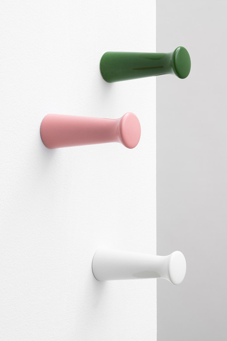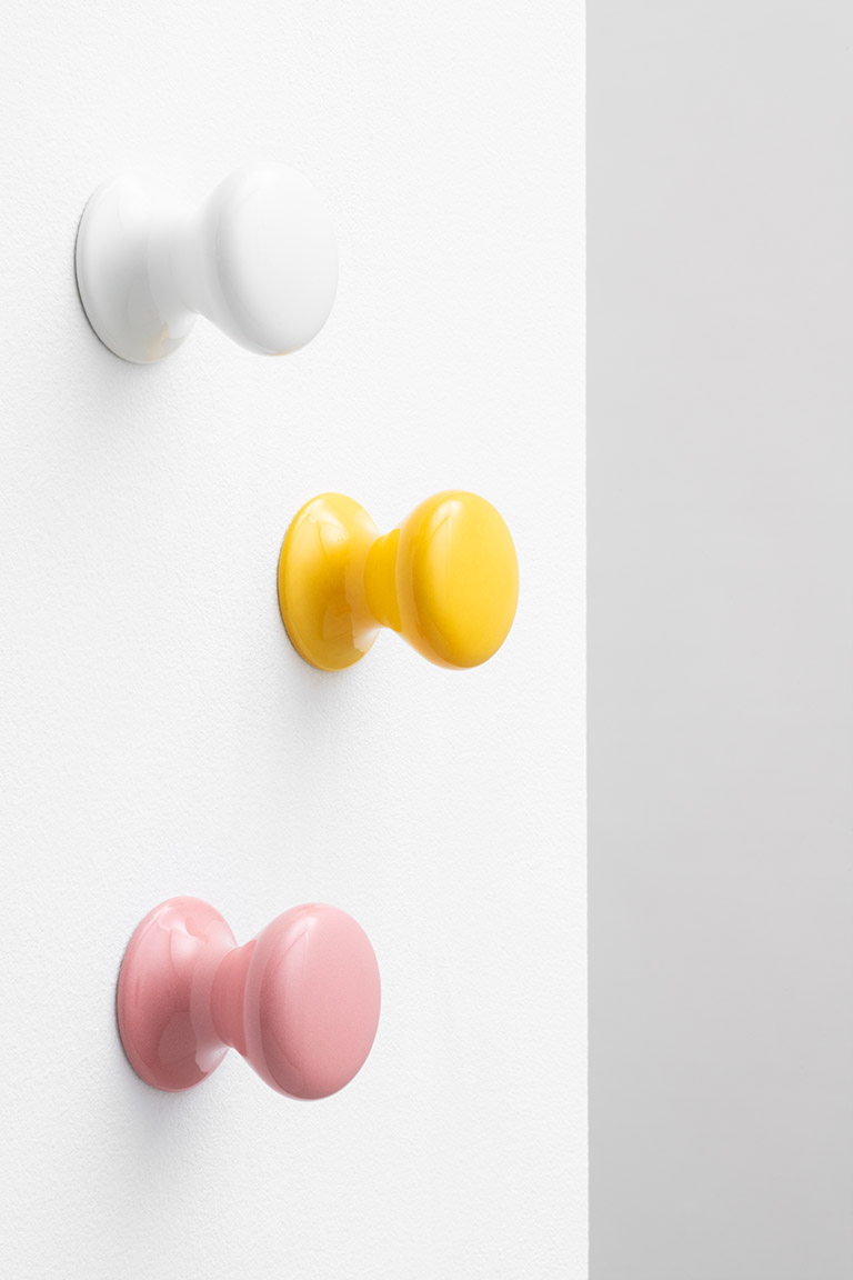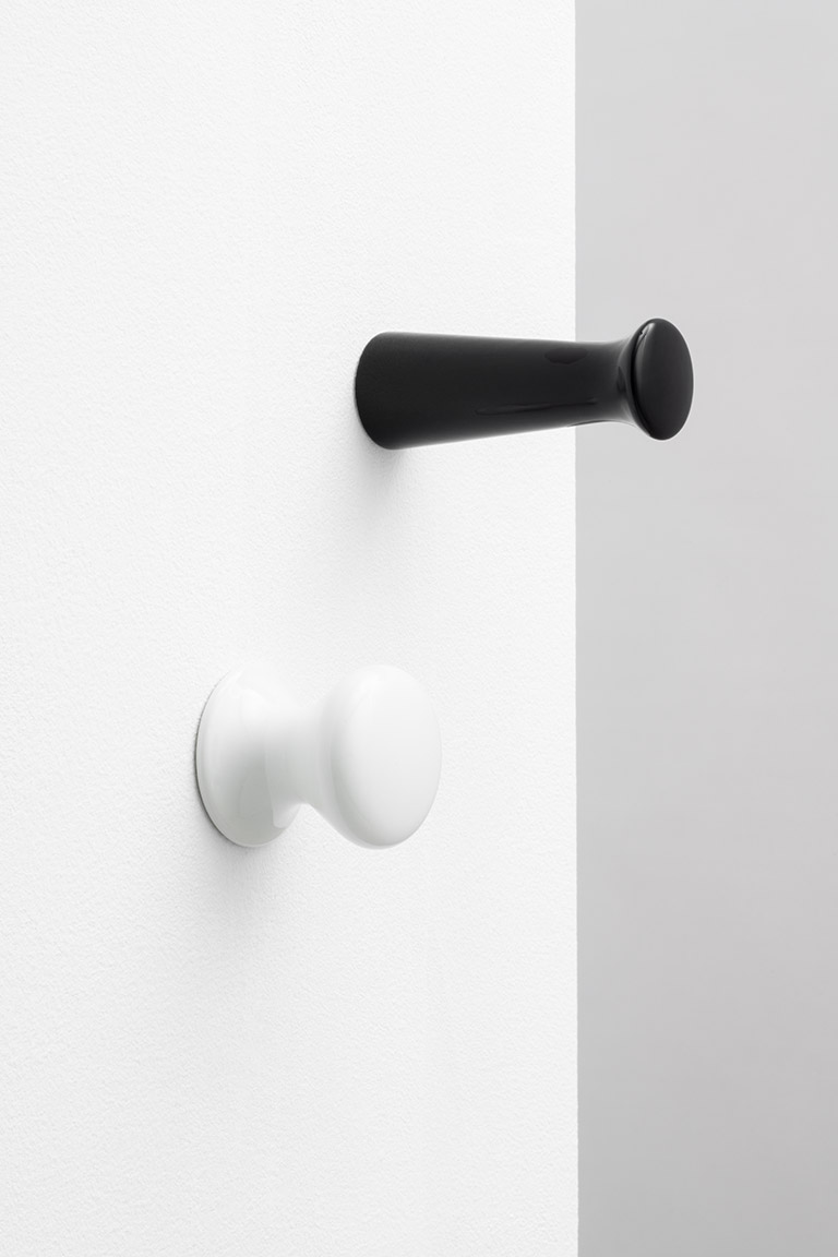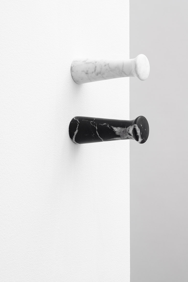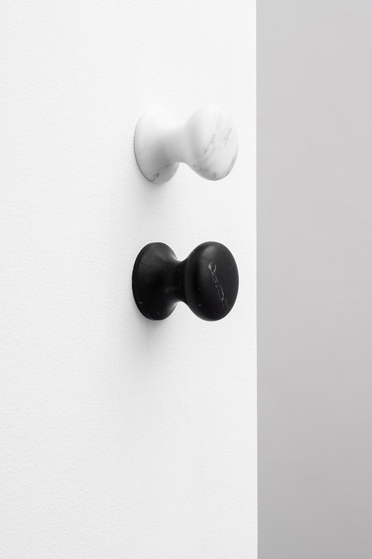 L’ammirazione di Herzog & de Meuron per l’artigianato della tornitura del legno si trova in numerosi dettagli architettonici incorporati negli edifici passati e presenti. Questa passione è culminata in un’ampia gamma di forme geometriche tornite, tra cui il Knook knob e hook in marmo e ceramica per Danese Milano. A differenza di altre varianti, questa matericità della pietra offre un nuovo incontro tattile ed è adatta anche per l’uso in zone umide. La forma geometrica, basata su una forma tornita, presenta un profilo curvo che si adatta alla lavorazione e alle caratteristiche del marmo e della ceramica. Due geometrie semplici, due materiali, marmo e ceramica, una gamma di colori, delineano una collezione di ganci appendiabiti funzionali ed essenziali. Uno ha un incavo più segnato, l’altro è un gancio più allungato per accogliere i diversi accessori e vestiti, ed integrarsi al meglio negli spazi e negli arredi.