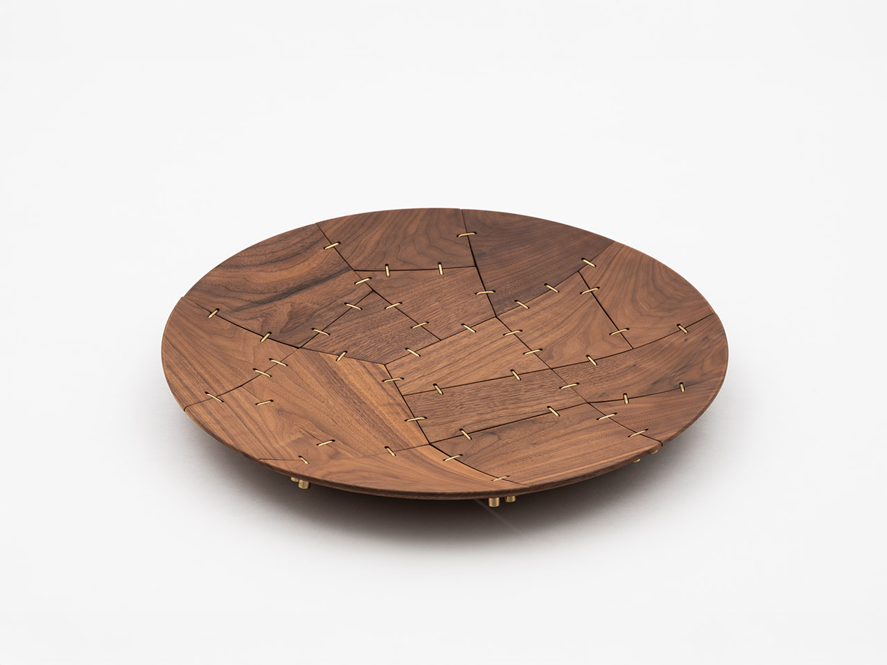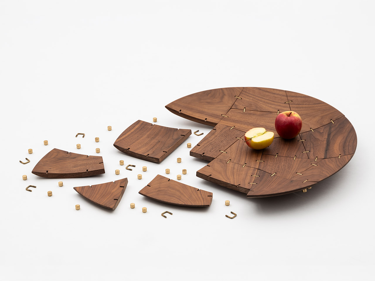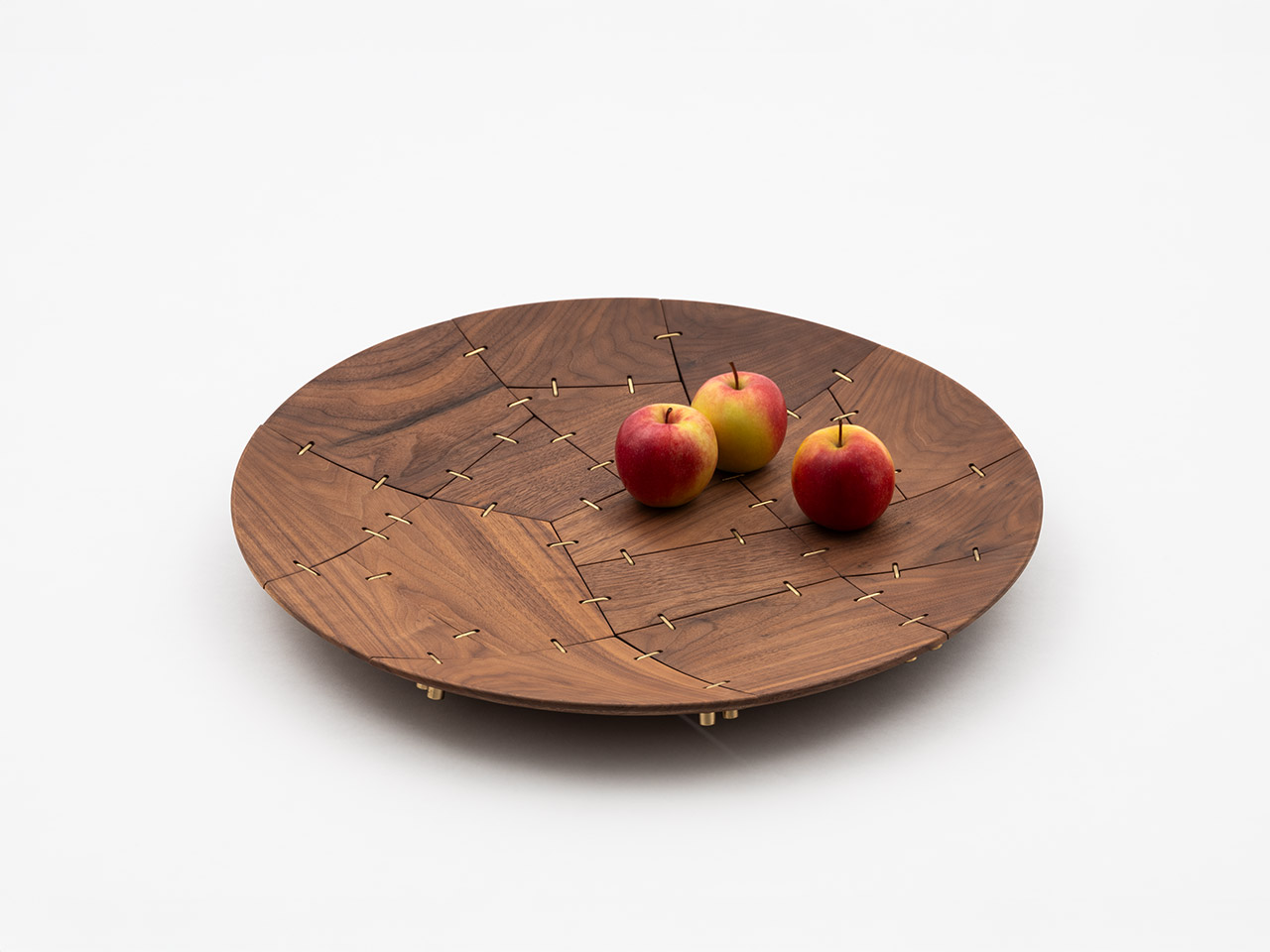 Accostando frammenti di legno e unendoli con semplici viti, nasce Kintsugi: un piatto in noce ricomposto come un puzzle. Questo gioco da montare, composto da piccoli pezzi che acquistano significato solo quando vengono uniti, rimanda all’antica tecnica giapponese del kintsugi: le crepe degli oggetti frantumati, invece di essere nascoste, vengono esaltate, sottolineando il valore del gesto manuale che sa prendersi cura delle cose, restituendo loro dignità e significato. L’atto di assemblare i frammenti richiede pazienza e precisione, senza l’ausilio della tecnologia. Questo processo induce uno stato mentale di calma e accettazione, poiché il risultato si costruisce poco alla volta.