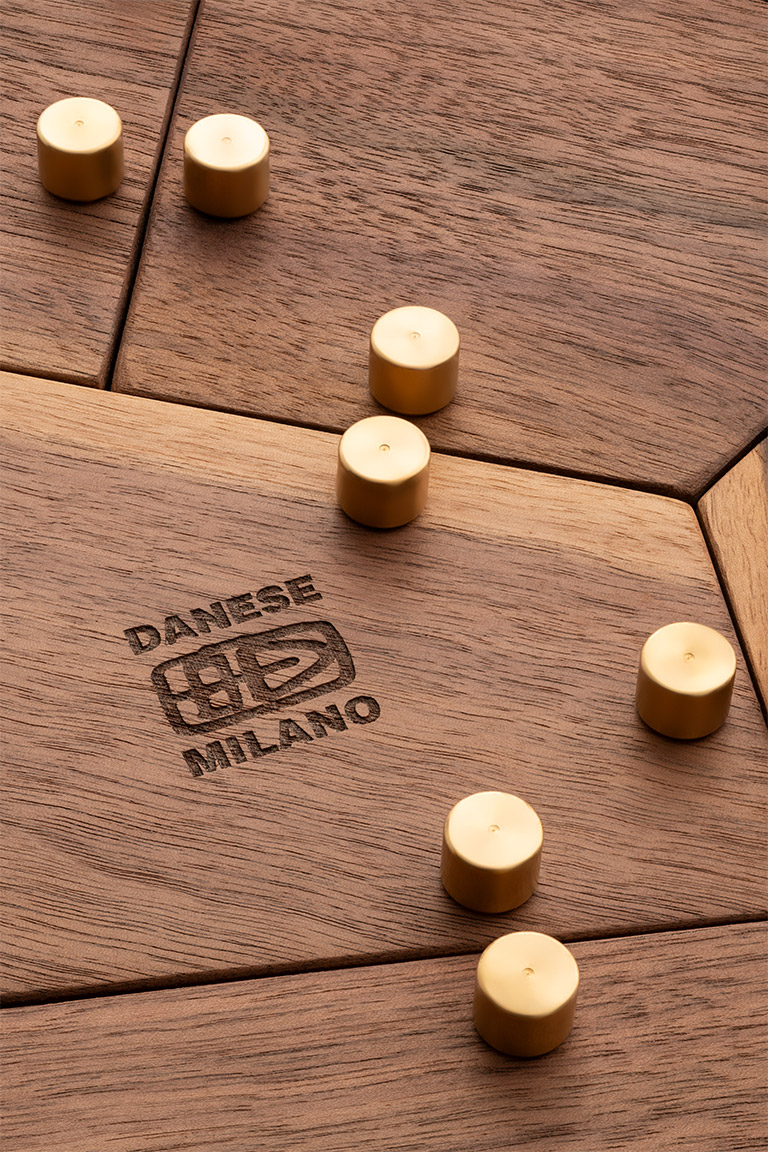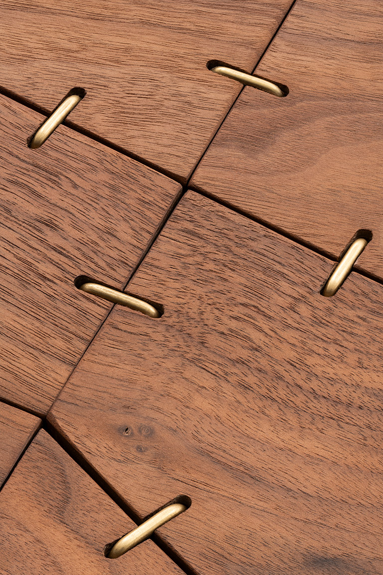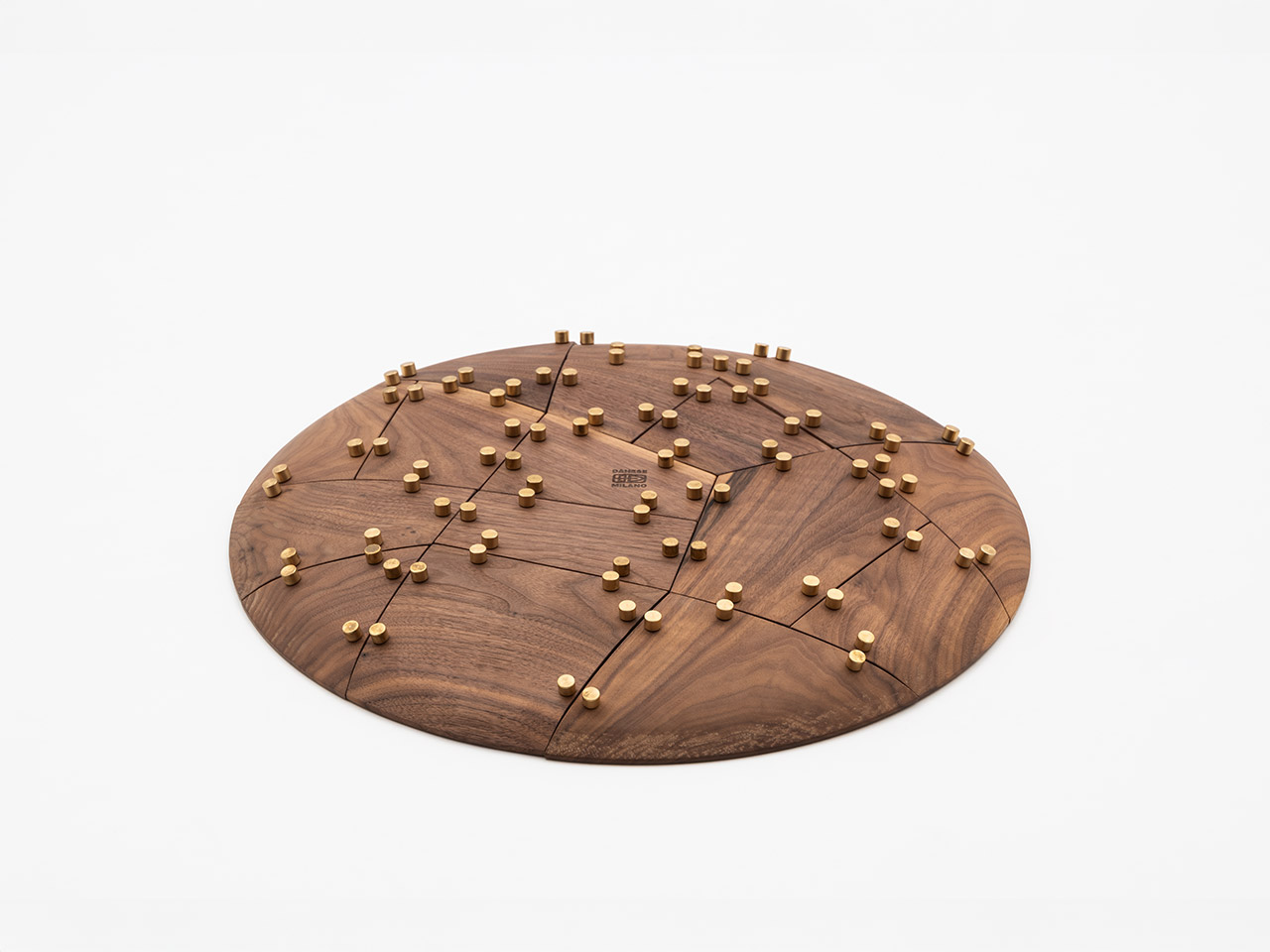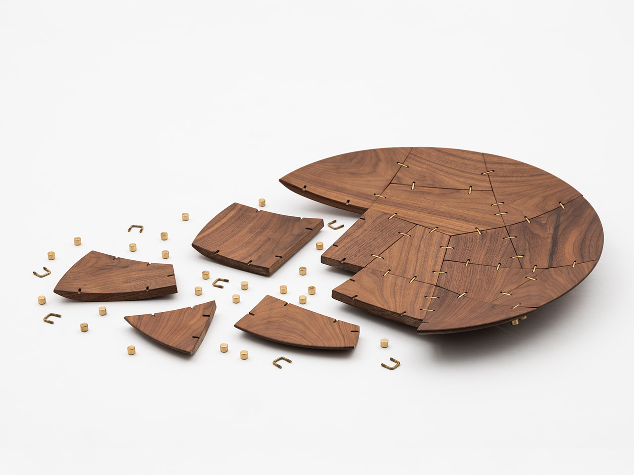 Accostando frammenti di legno e unendoli con semplici viti, nasce Kintsugi: un piatto in noce ricomposto come un puzzle. Questo gioco da montare, composto da piccoli pezzi che acquistano significato solo quando vengono uniti, rimanda all’antica tecnica giapponese del kintsugi: le crepe degli oggetti frantumati, invece di essere nascoste, vengono esaltate, sottolineando il valore del gesto manuale che sa prendersi cura delle cose, restituendo loro dignità e significato. L’atto di assemblare i frammenti richiede pazienza e precisione, senza l’ausilio della tecnologia. Questo processo induce uno stato mentale di calma e accettazione, poiché il risultato si costruisce poco alla volta.
